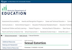 Kentucky Department of Education – Senate Bill 73 2025​, related to sexual extortion, was passed during the 2025 legislative session and requires the district to provide the information about sexual extortion to help ensure that parents/guardians have the resources they need to support their student(s) and protect them from being victimized (KRS 531.125).​